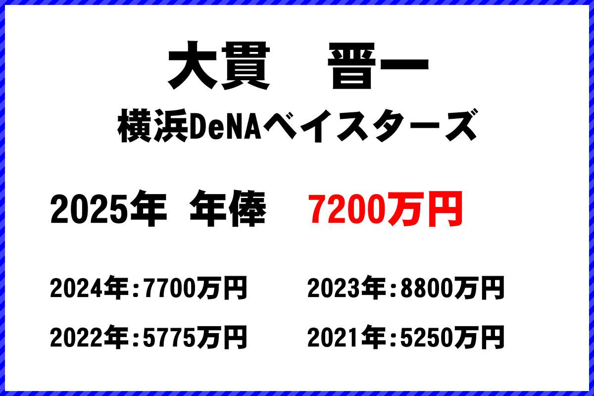 2025年 横浜DeNAベイスターズ所属 大貫晋一選手の年俸は7200万円です。