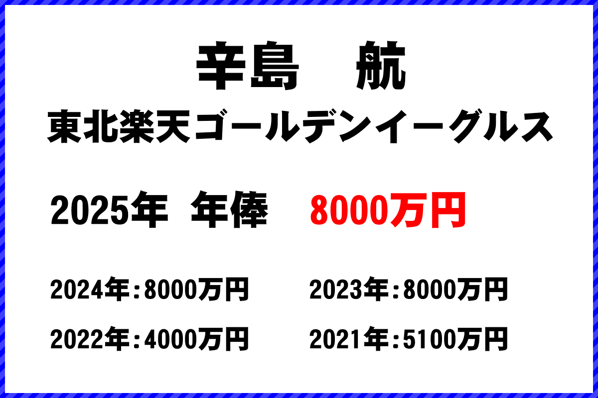2025年 東北楽天ゴールデンイーグルス所属 辛島航選手の年俸は8000万円です。