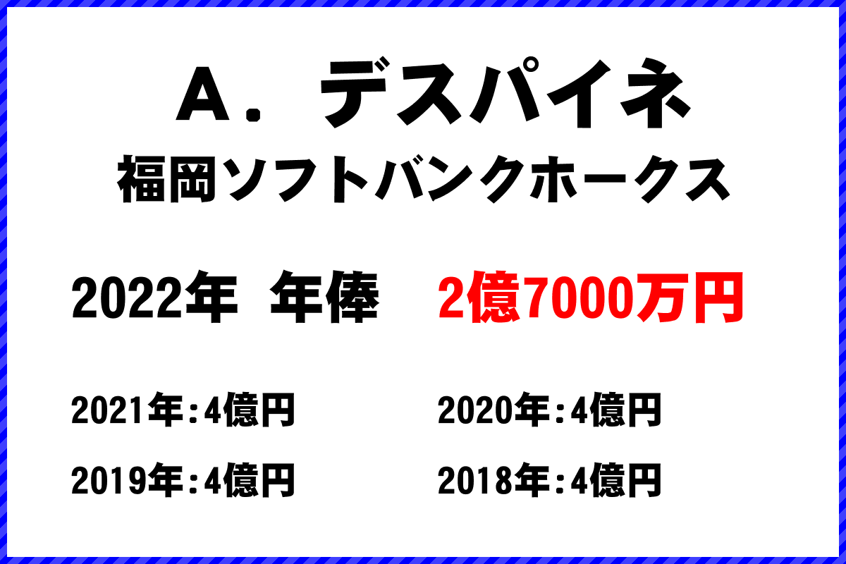 2022年 福岡ソフトバンクホークス所属 A.デスパイネ選手の年俸は2億7000万円です。