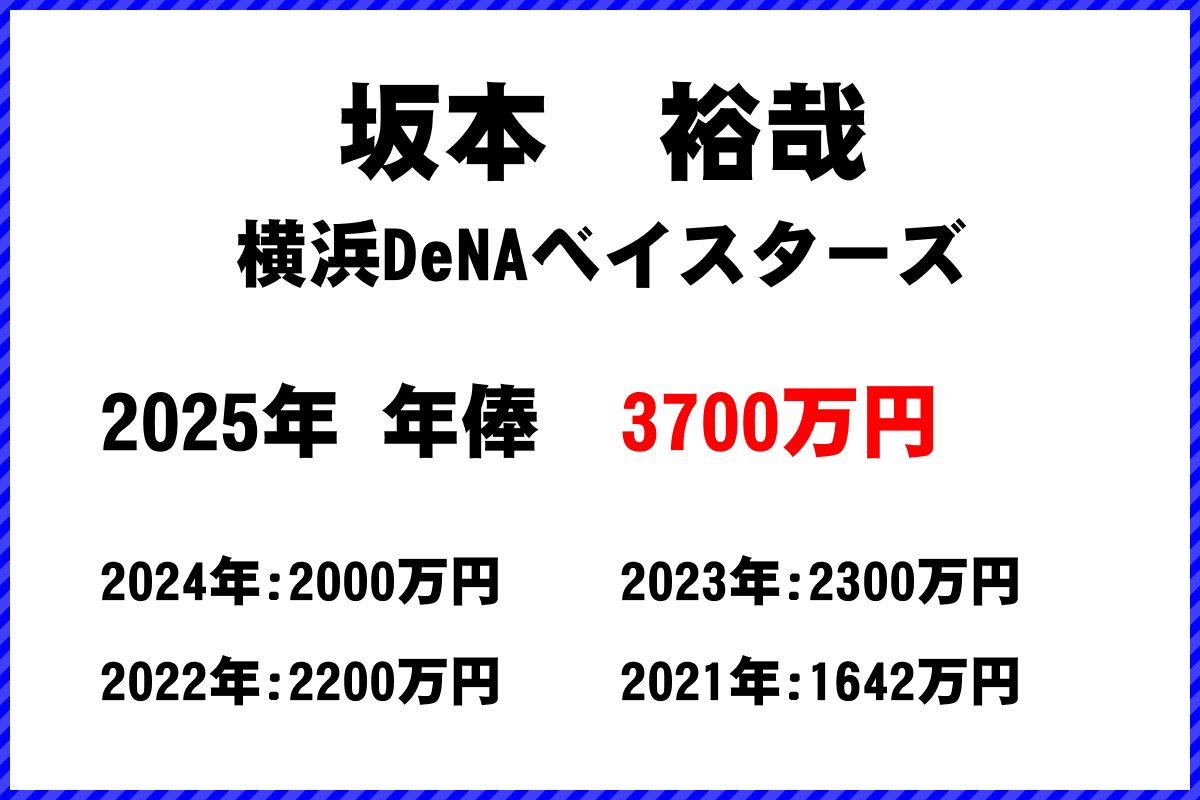 2025年 横浜DeNAベイスターズ所属 坂本裕哉選手の年俸は3700万円です。