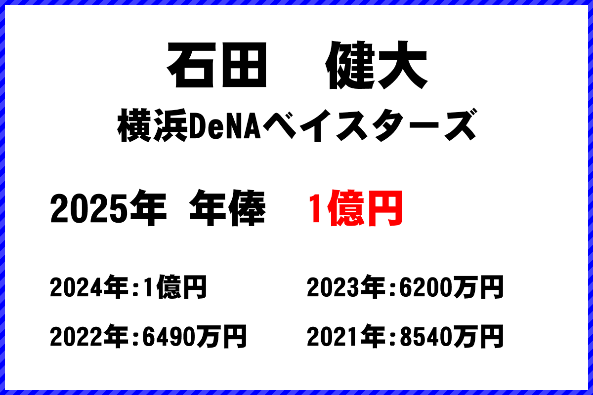 2025年 横浜DeNAベイスターズ所属 石田健大選手の年俸は1億円です。