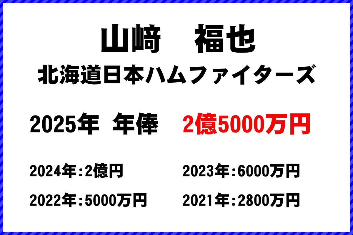 2025年 北海道日本ハムファイターズ所属 山﨑福也選手の年俸は2億5000万円です。