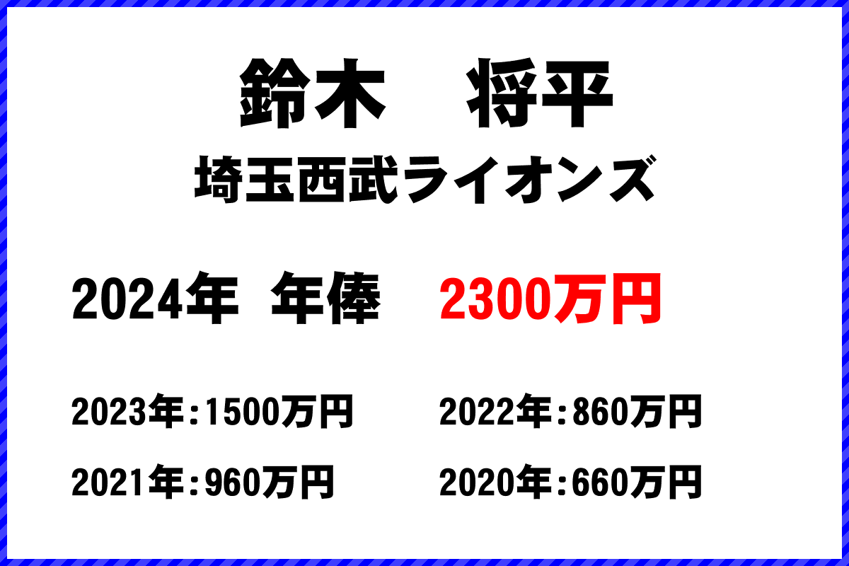 2024年 埼玉西武ライオンズ所属 鈴木将平選手の年俸は2300万円です。
