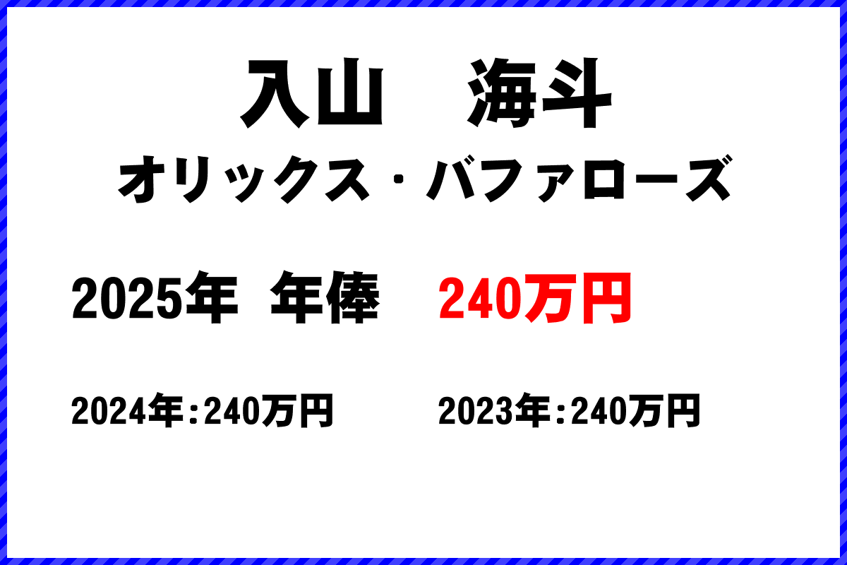 2025年 オリックス・バファローズ所属 入山海斗選手の年俸は240万円です。