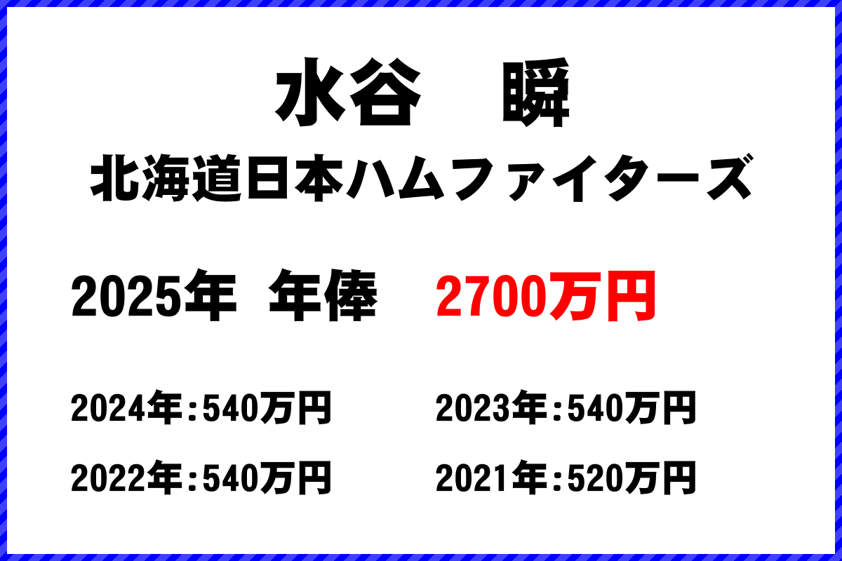 2025年 北海道日本ハムファイターズ所属 水谷瞬選手の年俸は2700万円です。