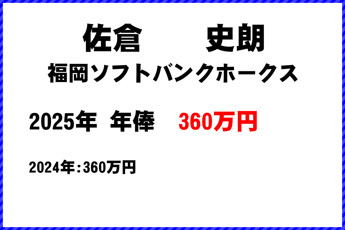 2025年 福岡ソフトバンクホークス所属 佐倉俠史朗選手の年俸は360万円です。