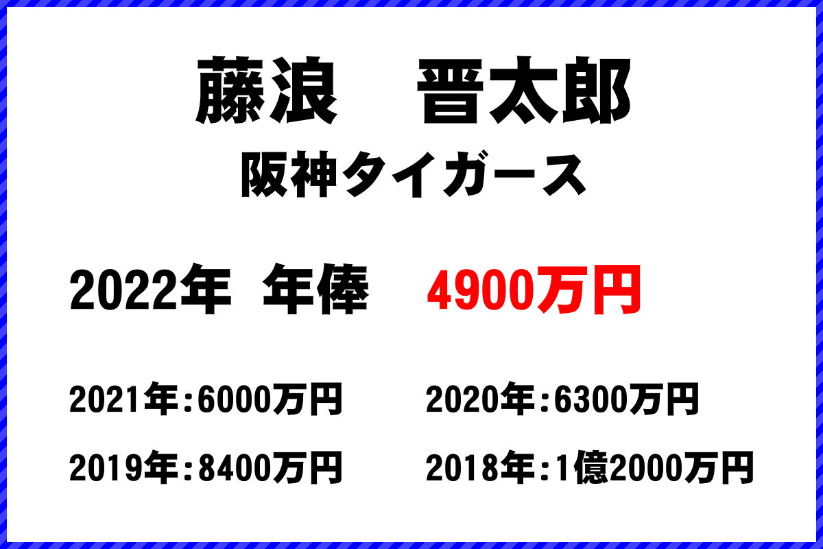 2022年 阪神タイガース所属 藤浪晋太郎選手の年俸は4900万円です。
