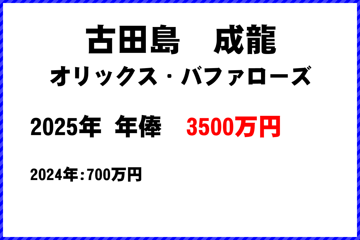 2025年 オリックス・バファローズ所属 古田島成龍選手の年俸は3500万円です。