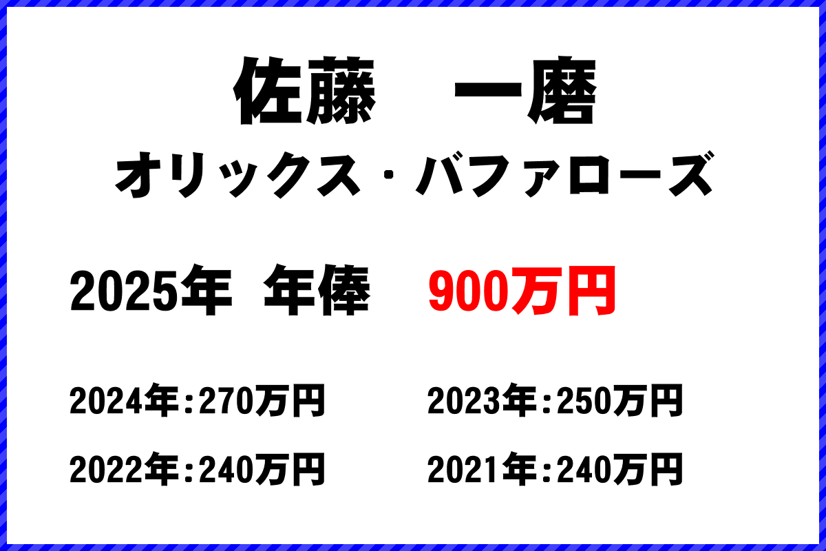 2025年 オリックス・バファローズ所属 佐藤一磨選手の年俸は900万円です。
