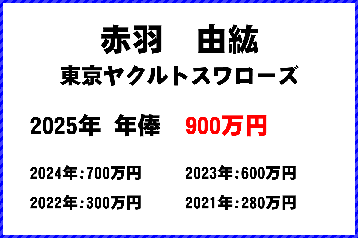 2025年 東京ヤクルトスワローズ所属 赤羽由紘選手の年俸は900万円です。