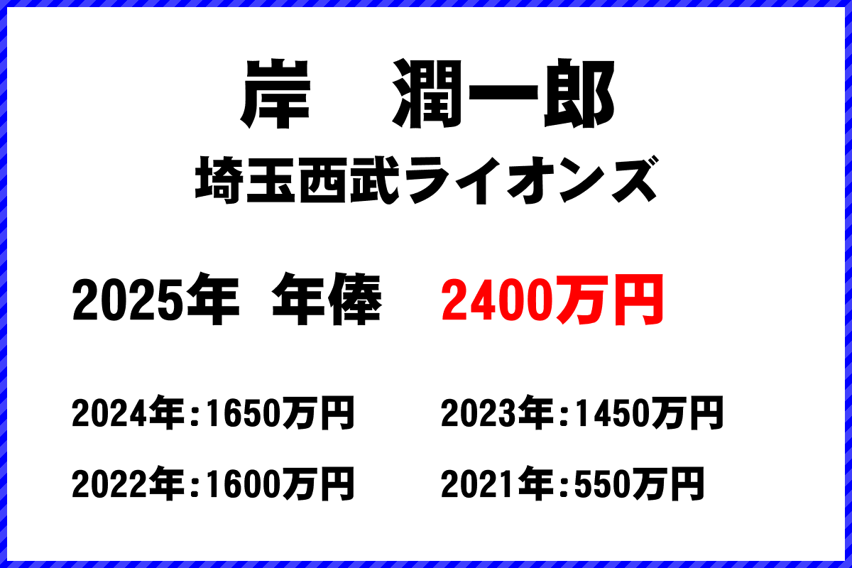2025年 埼玉西武ライオンズ所属 岸潤一郎選手の年俸は2400万円です。