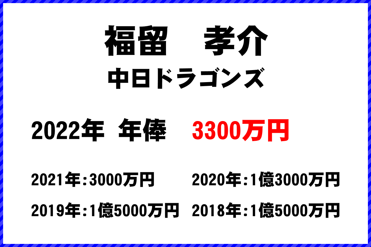 2022年 中日ドラゴンズ所属 福留孝介選手の年俸は3300万円です。