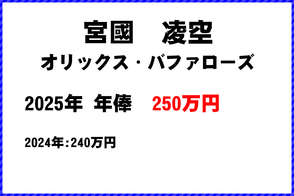 2025年 オリックス・バファローズ所属 宮國凌空選手の年俸は250万円です。