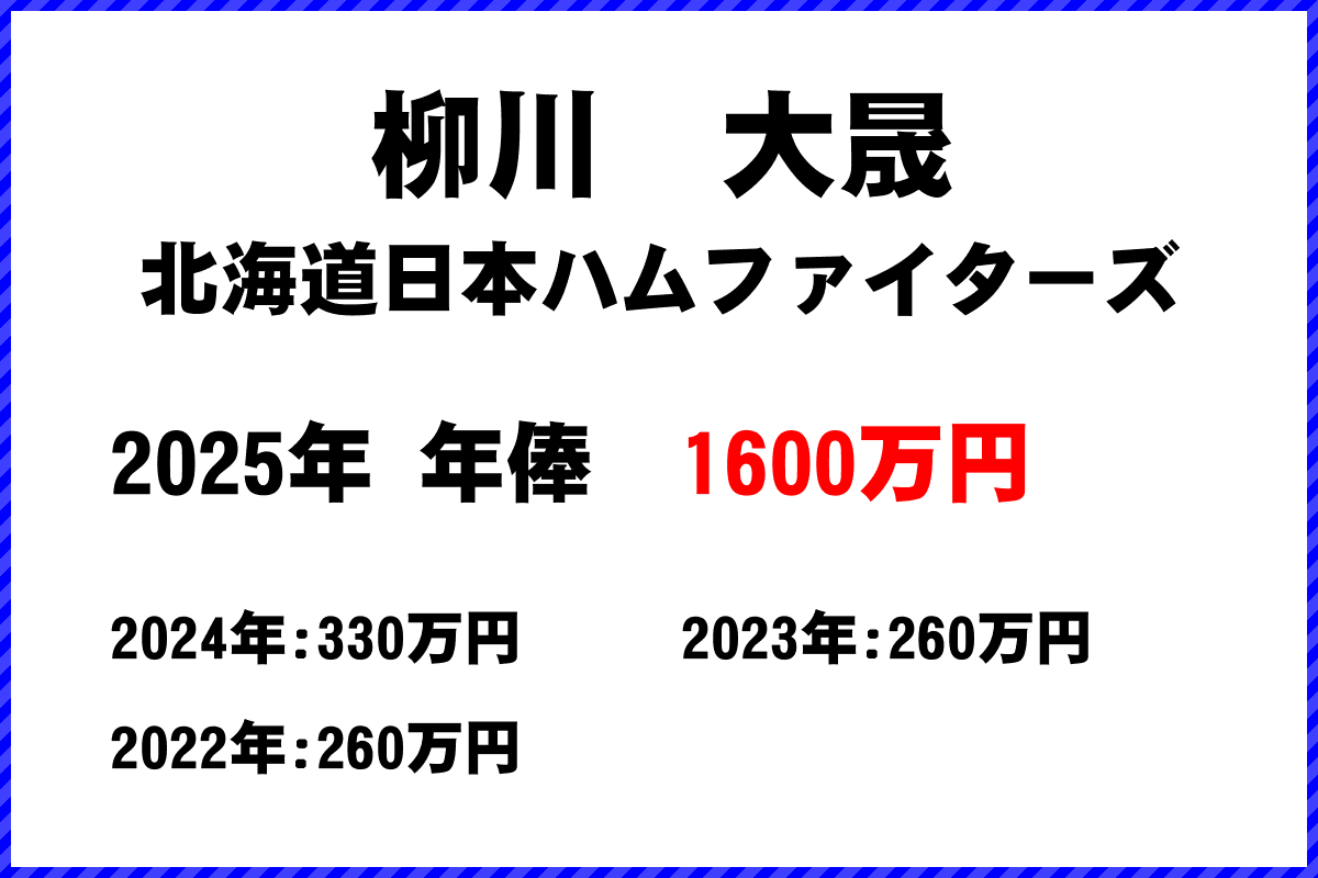 2025年 北海道日本ハムファイターズ所属 柳川大晟選手の年俸は1600万円です。