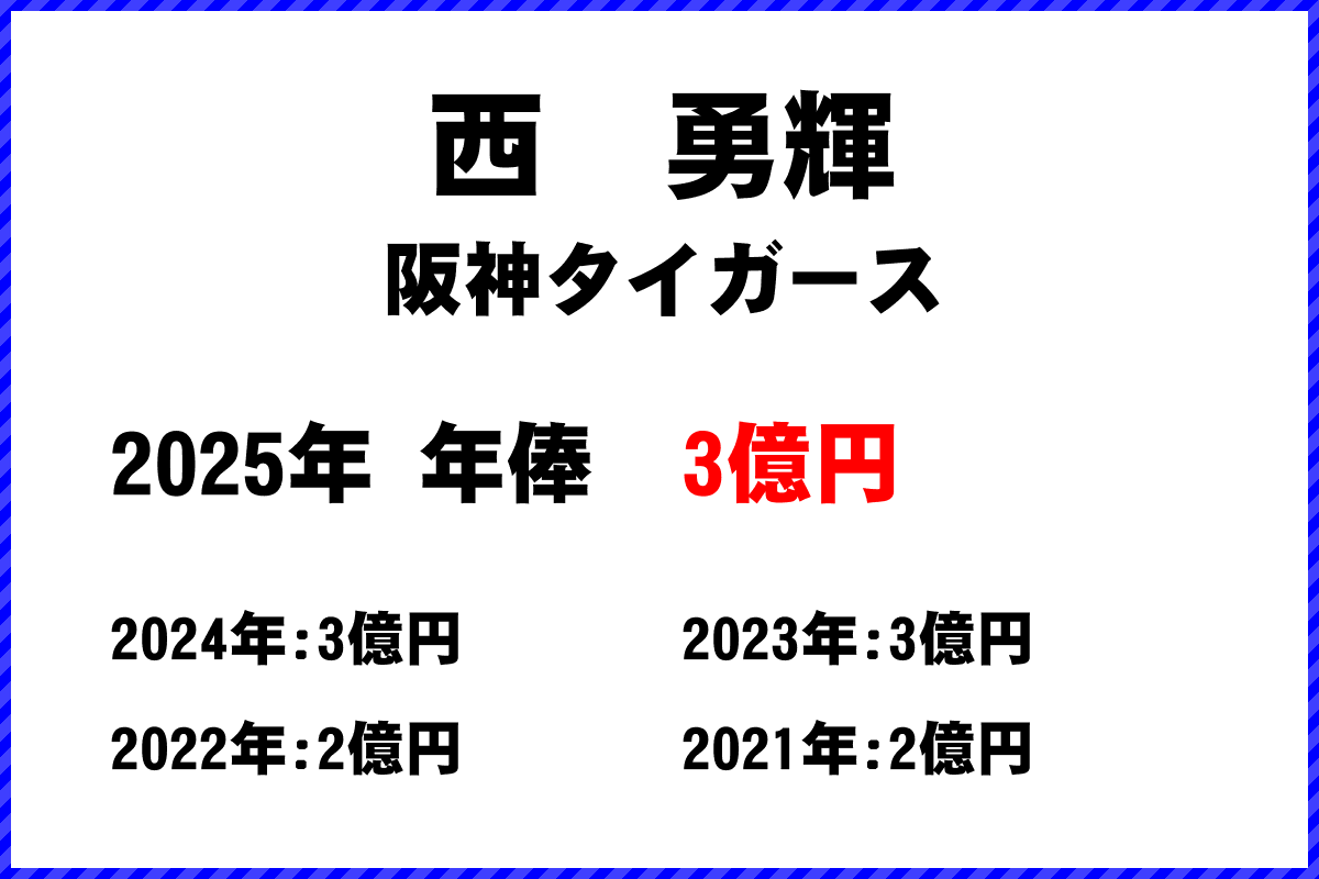 2025年 阪神タイガース所属 西勇輝選手の年俸は3億円です。