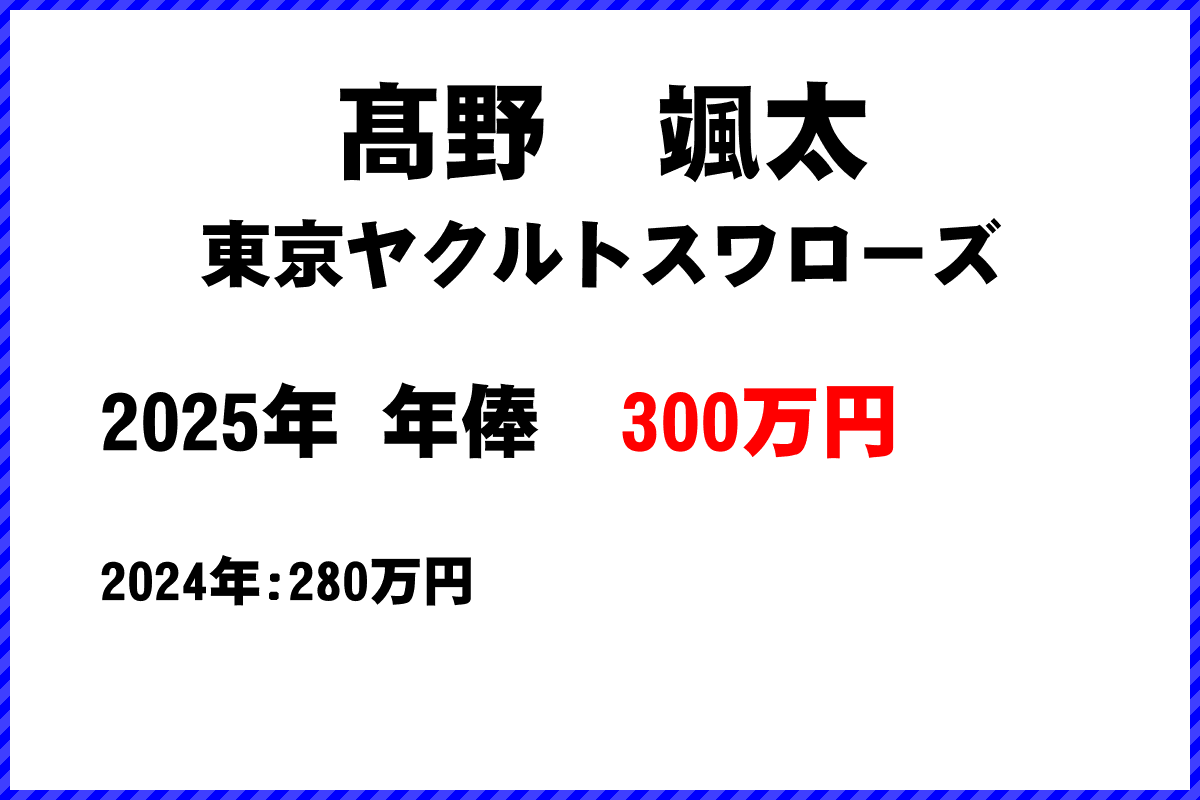 2025年 東京ヤクルトスワローズ所属 髙野颯太選手の年俸は300万円です。