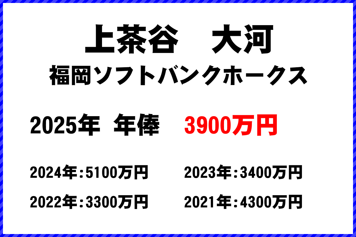 2025年 福岡ソフトバンクホークス所属 上茶谷大河選手の年俸は3900万円です。