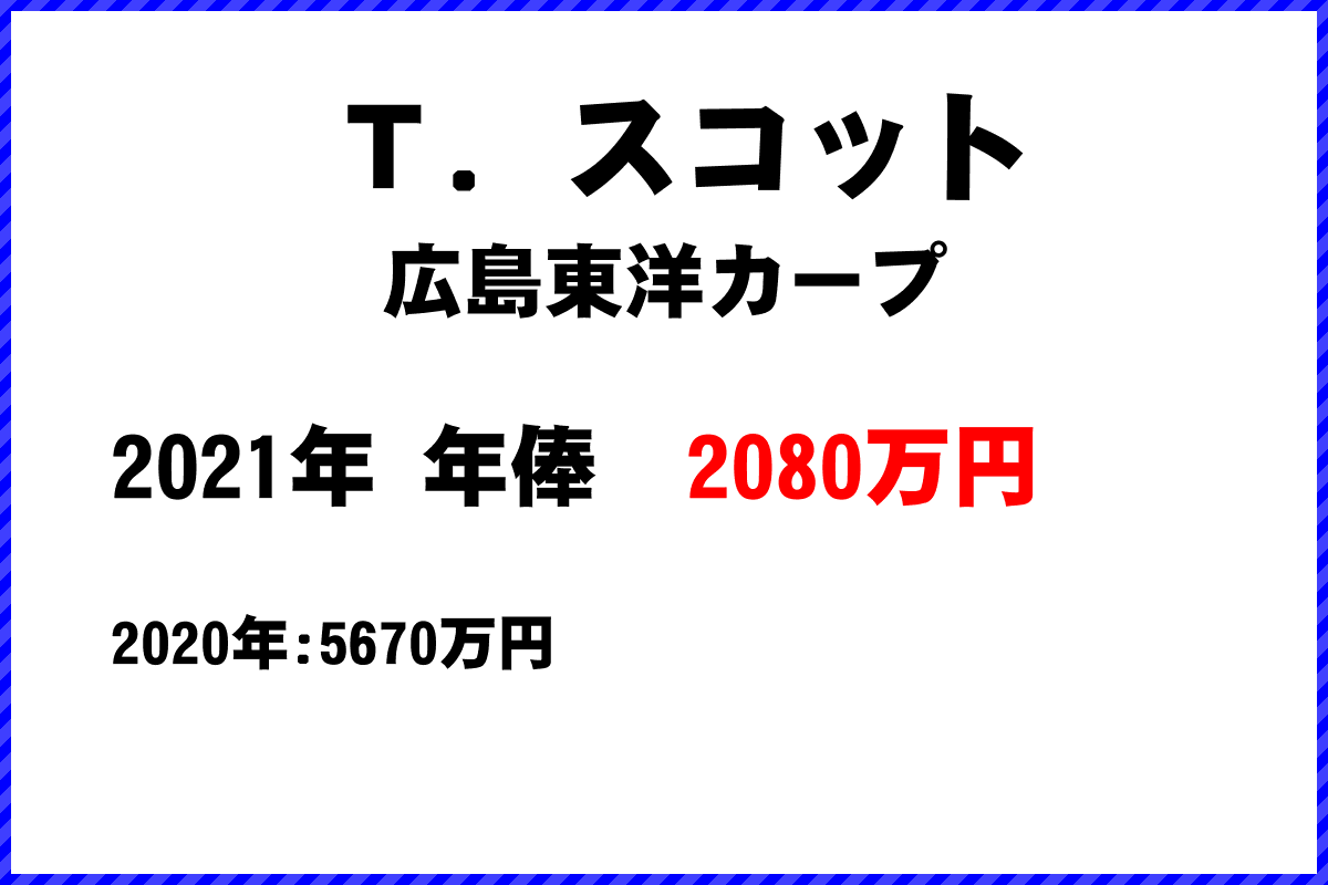 2021年 広島東洋カープ所属 T.スコット選手の年俸は2080万円です。