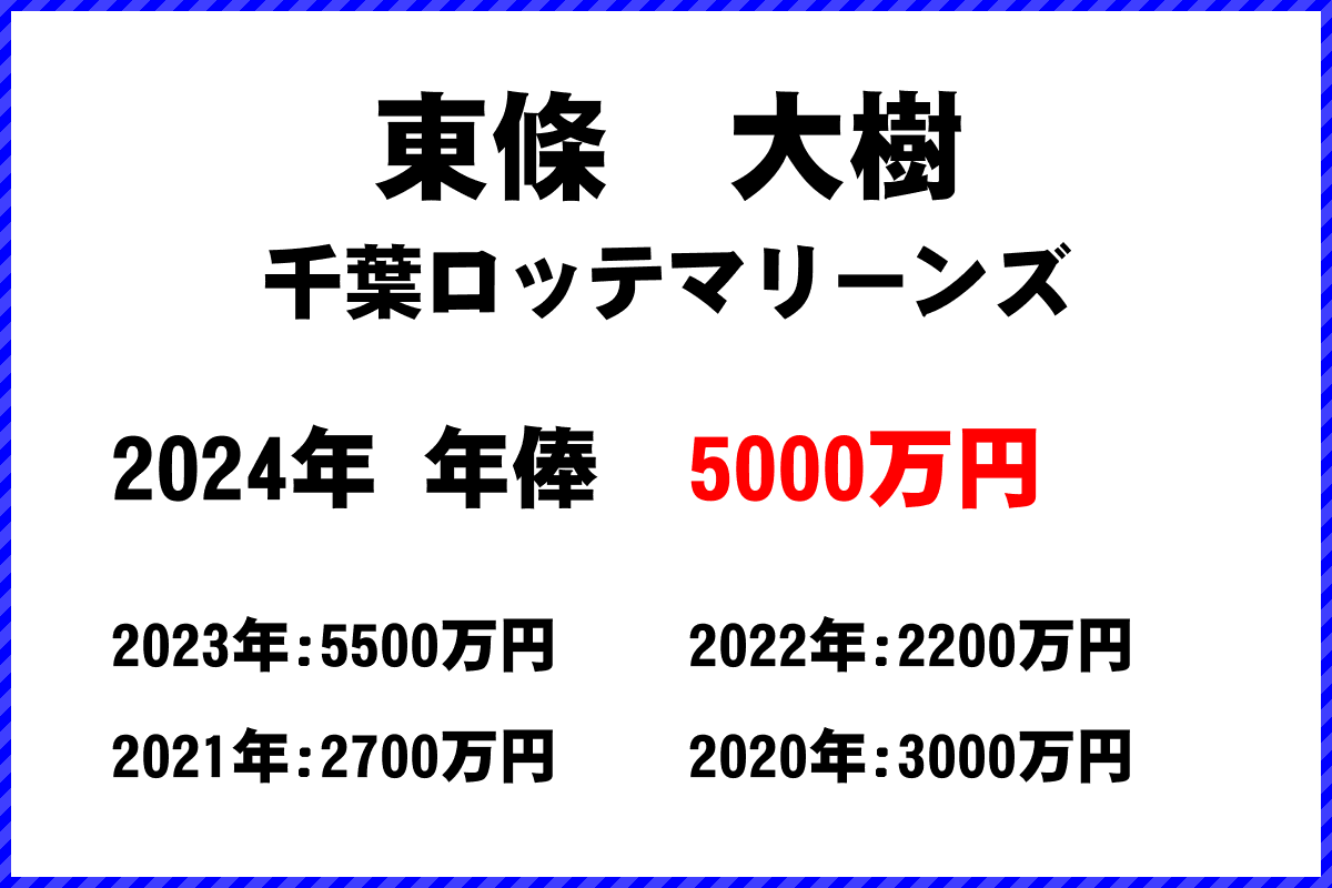 2024年 千葉ロッテマリーンズ所属 東條大樹選手の年俸は5000万円です。