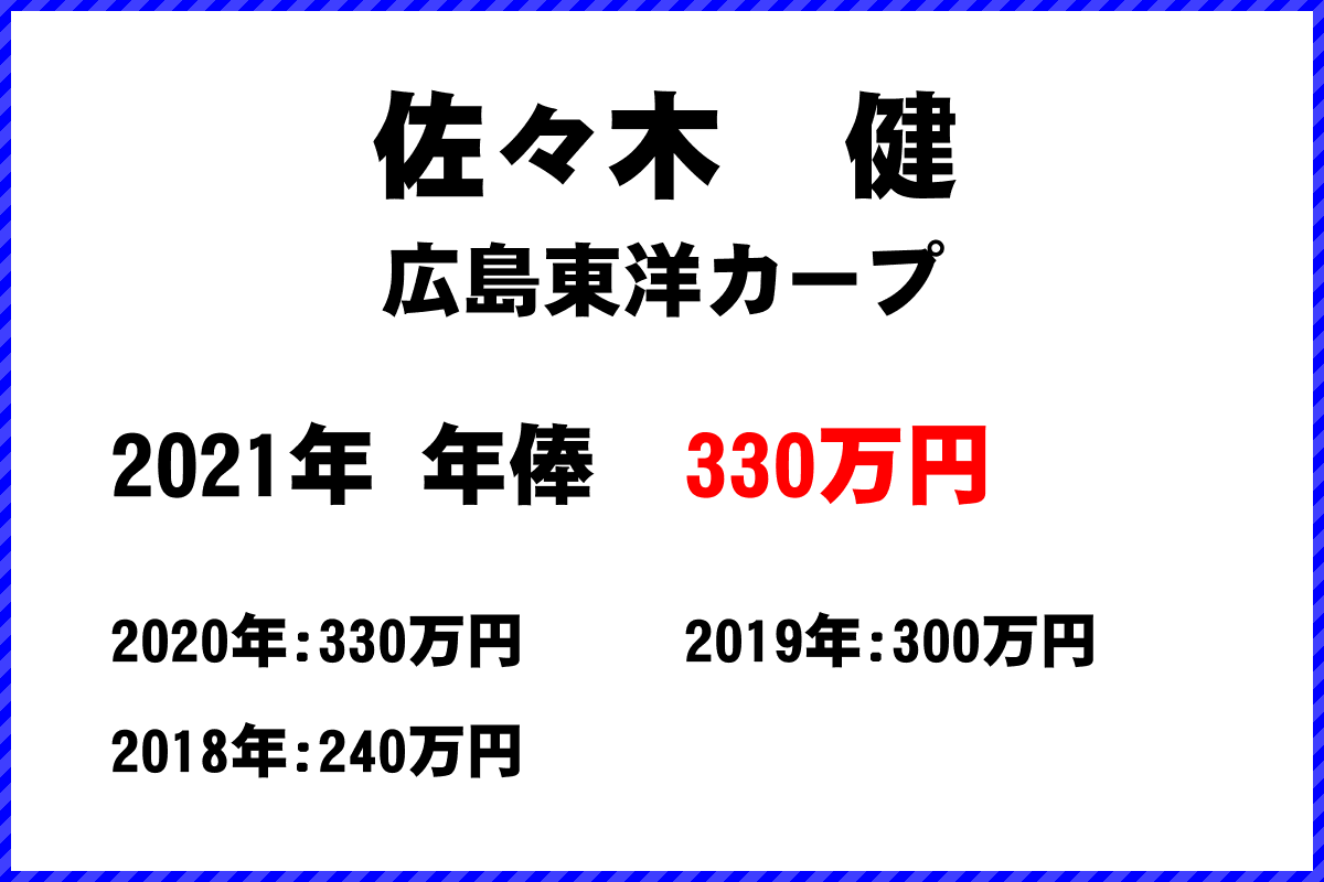 2021年 広島東洋カープ所属 佐々木健選手の年俸は330万円です。