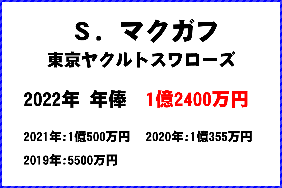 2022年 東京ヤクルトスワローズ所属 S.マクガフ選手の年俸は1億2400万円です。