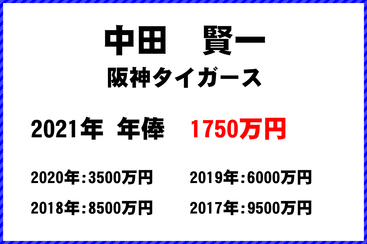 2021年 阪神タイガース所属 中田賢一選手の年俸は1750万円です。