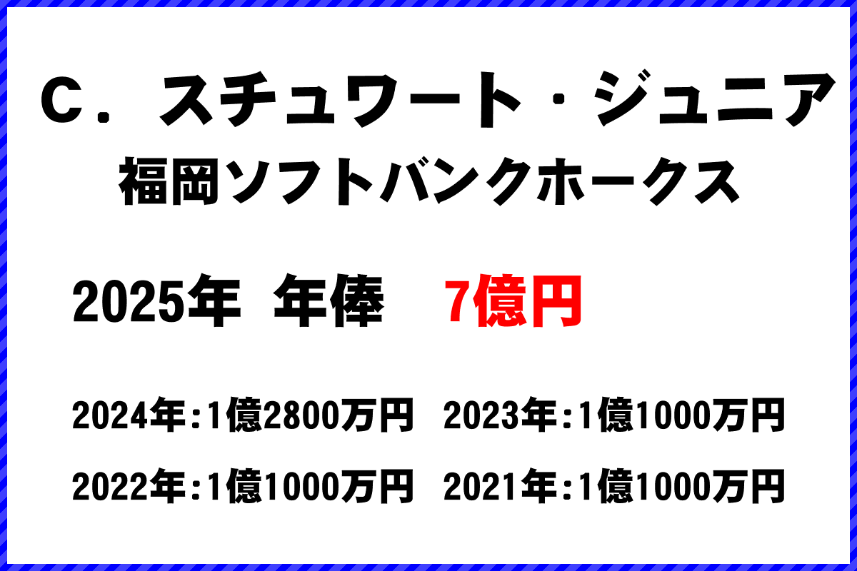 2025年 福岡ソフトバンクホークス所属 C.スチュワート・ジュニア選手の年俸は7億円です。